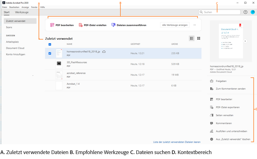 Deutsch English Produktbeschreibung Product Description Acrobat 2020 ist die neueste Desktop-Version von Acrobat mit Dauerlizenz. Es vereinfacht alltägliche PDF-Aufgaben und umfasst viele Produktivitätsverbesserungen für den Umgang mit PDF-Dateien über Desktopgeräte. Neue Startseite-Ansicht Die neue Startseite-Ansicht hilft Ihnen, organisiert und produktiv zu bleiben – ein zentraler Platz zum Organisieren, Verwalten und Suchen nach all Ihren PDF-Dateien. Liste der letzten Dateien: Zeigt Ihre zuletzt geöffneten Dateien an, die von Ihrem Computer, Document Cloud-Speicher oder Speicher von Drittanbietern wie OneDrive, Dropbox, Box und SharePoint angezeigt werden. Empfohlene Werkzeuge: Hilft Ihnen, die besten Acrobat-Werkzeuge wie „PDF bearbeiten“, „PDF erstellen“, „PDF-Dateien zusammenführen“ und viele mehr zu finden. Suchfeld: Durchsuchen Sie alle Ihre Document Cloud-Dateien und die Dateien, die zum Anzeigen, Überprüfen oder Unterschreiben gesendet wurden. Kontextbereich: Hiermit können Sie Aktionen für Dateien in allen Startseite-Ansichten mit kontextabhängigen Menüs vornehmen sowie den Status der Teilnehmer und den Aktionsverlauf für freigegebene Dokumente anzeigen. MIP-geschützte PDF-Dateien in Acrobat 2020 und Reader 2020 anzeigen Ab sofort können Sie mit den Windows- und Mac-Desktop-Anwendungen von Adobe Acrobat 2020 und Acrobat Reader 2020 Dateien öffnen, die mit MIP-Lösungen (Microsoft Information Protection) geschützt sind, einschließlich Azure Information Protection (AIP) und Information Protection mit Office 365. Acrobat 2020 und Acrobat Reader 2020 erkennen eine MIP-geschützte Datei automatisch und fordern Sie auf, das entsprechende Plug-in von der Hilfeseite herunterzuladen. Wenn Sie das Zusatzmodul heruntergeladen und installiert haben, lassen sich die geschützten Dateien wie alle anderen PDF-Dateien in Acrobat oder Reader öffnen. Farbanpassungsfunktion im Werkzeug „Ausfüllen und unterschreiben“ Sie können nun mit dem Werkzeug „Ausfüllen und unterschreiben“ in Acrobat 2020 die gewünschte Farbe auswählen, mit der das PDF-Formular ausgefüllt wird, und es dann unterschreiben. Um die Farbe zu ändern, klicken Sie in der Werkzeugleiste für „Ausfüllen und unterschreiben“ auf die Schaltfläche „Farbe“. Standardmäßig ist die Farbe der Signatur schwarz. Um die Standardfarbe beizubehalten, deaktivieren Sie das Kontrollkästchen Originalfarbe für Signaturen beibehalten. Weitere Informationen dazu finden Sie unter Ausfüllen des PDF-Formulars. OCR für gescannte Dokumente mit Live Text ausführen Acrobat 2020 kann jetzt OCR für gescannte PDF-Dateien ausführen, die Bilder mit Live Text enthalten. 1. Öffnen Sie die gescannte PDF-Datei in Acrobat 2020. 2. Wählen Sie Werkzeuge > Scans verbessern > Texterkennung > In dieser Datei. 3. Klicken Sie in der Werkzeugleiste auf Einstellungen. Das Dialogfeld „Text erkennen“ wird angezeigt. 4. Wählen Sie in der Ausgabe-Dropdown-Liste Durchsuchbares Bild oder Durchsuchbares Bild (exakt) und klicken Sie auf OK. 5. Klicken Sie auf Text erkennen in der Werkzeugleiste. Preflight-Erweiterungen und PDF/UA-Validierung im Preflight Preflight-Bibliotheken: Preflight-Profile, Korrekturen und Prüfungen sind jetzt in Bibliotheken organisiert. Preflight-Variablen: Mit Variablen können Sie Profile, Prüfungen und Korrekturen beim Anwenden dynamisch anpassen. Variablen können bei der Bearbeitung von Profilen, Prüfungen oder Korrekturen verwendet werden, wenn das orangefarbene Dreieck angezeigt wird. Über Variablen können Sie außerdem nach bestehenden Objekten filtern. Preflight unterstützt die neue Ghent Workgroup PDF‑Spezifikation 2015: Die neuen GWG-Spezifikationen basieren auf PDF/X-4 und unterstützen native Transparenz sowie medienneutrale RGB-Workflows. PDF/UA-Validierung in Preflight: Preflighter ermöglicht es nun, häufige Barrierefreiheitsprobleme zu beheben und Validierungen anhand des internationalen universellen Standards der Zugänglichkeit PDF/UA durchzuführen. Verbesserungen und Aktualisierungen der Barrierefreiheitsfunktion und verbesserte Workflows Verbesserte Barrierefreiheitsfunktionen in Acrobat 2020 erleichtern es Menschen mit Behinderungen, PDF-Dokumente und -Formulare mit und ohne Hilfe von unterstützender Software, Technologie und Geräten zu verwenden. Verbesserte Nutzererfahrung mit DirectInk Das verbesserte Stiftwerkzeug mit DirectInk-Technologie ermöglicht es Ihnen, noch einfacher und präziser direkt auf das Dokument zu schreiben und zu zeichnen, ohne ein Werkzeug auszuwählen. PDF-Dateien mit DirectInk signieren Die neue DirectInk-Unterstützung im Unterschriftenfeld der Certificates-App bietet ein natürlicheres Erlebnis und verschafft Ihnen mehr Kontrolle darüber, wie Ihre Unterschrift aussieht, wenn Sie auf Windows 10-Geräten unterschreiben. Touch Bar im MacBook Pro Funktionen für die Touch Bar im MacBook Pro integrierte helfen Ihnen, effizienter auf MacBook Pro-Computern zu arbeiten. Acrobat 2020 is the latest perpetual desktop version of Acrobat. It simplifies everyday PDF tasks and includes many productivity enhancements when working with PDFs from your desktop. New Home view The new Home view helps you stay organized and productive - it's a single place for you to organize, manage, and search for all your PDFs. Recent Files list: Displays your recent files opened for viewing from your computer, Document Cloud storage, or third-party storage like OneDrive, Dropbox, Box, and SharePoint. Recommended tools: Helps you discover top Acrobat tools like Edit PDF, Create PDF, Combine PDFs, and more. Search box: Lets you search all your Document Cloud files and the files sent or received for viewing, reviewing, or signing. Context pane: Helps you take actions on files across all Home view with context-sensitive menus, and check the status of participants and history of activities for shared documents. View MIP-protected PDFs in Acrobat 2020 and Reader 20