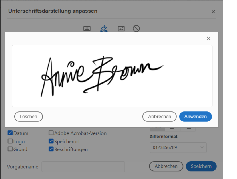 Standardmäßig ist die Farbe der Signatur schwarz. Um die Standardfarbe beizubehalten, deaktivieren Sie das Kontrollkästchen Originalfarbe für Signaturen beibehalten.
